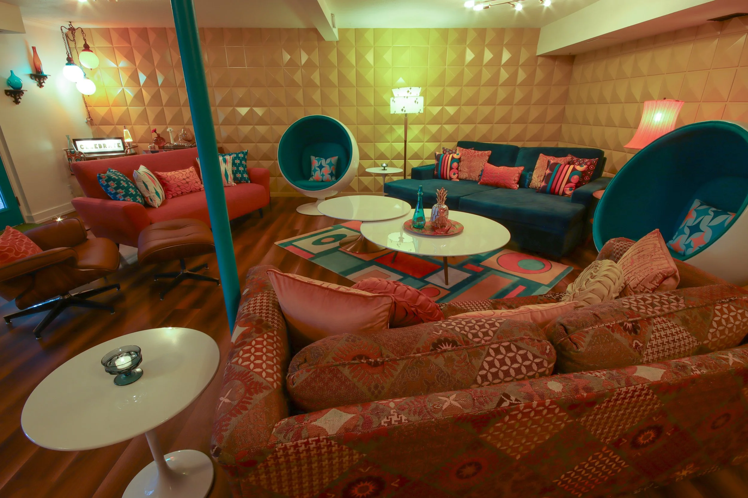 Because we don’t just design spaces—we set the scene. Our roots in vintage curation, storytelling, and event production mean we think in atmosphere, not just aesthetics. From vibrant cocktail lounges to cozy, wood-paneled nooks with a mod twist, we’re here to create moments that feel as good as they look.